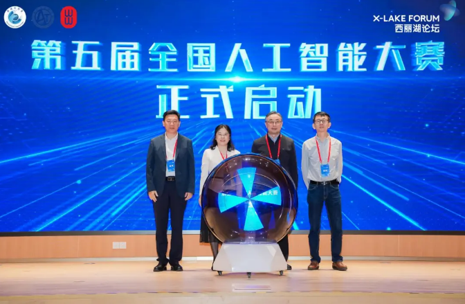 论坛上,杨建坤,新一代人工智能产业技术创新战略联盟联合秘书长张伟民,中国移动咪咕公司副总经理况铁梅,华为计算产品线竞赛负责人李增忠共同启动第五届全国人工智能大赛。
