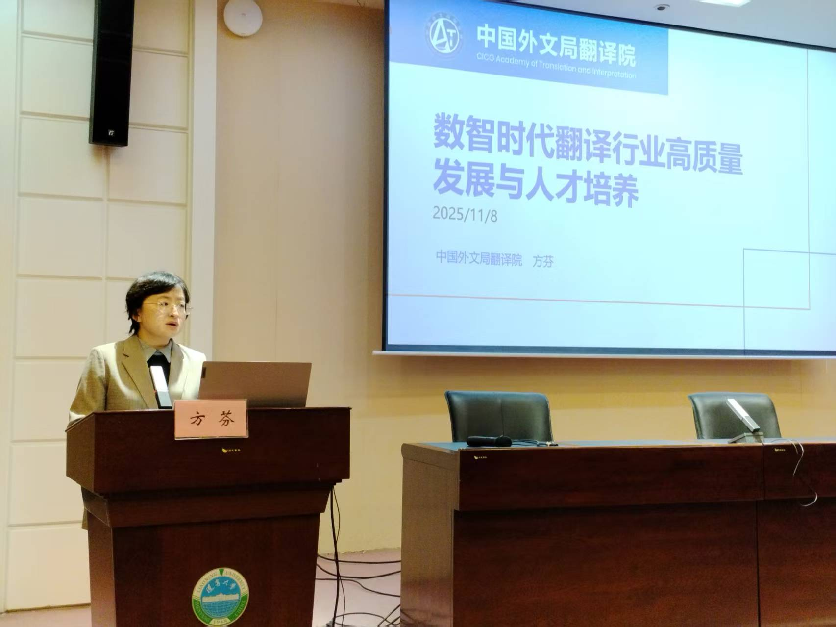 2025年11月8日,由辽宁大学外国语学院主办的“数智时代外语学科发展与人才培养”第五届蒲华高端论坛在辽宁沈阳成功举办。中国外文局翻译院副院长方芬出席论坛并作主旨发言,辽宁大学教务处处长赖博熙致开幕辞。论坛由辽宁大学外国语学院院长刘熠主持。