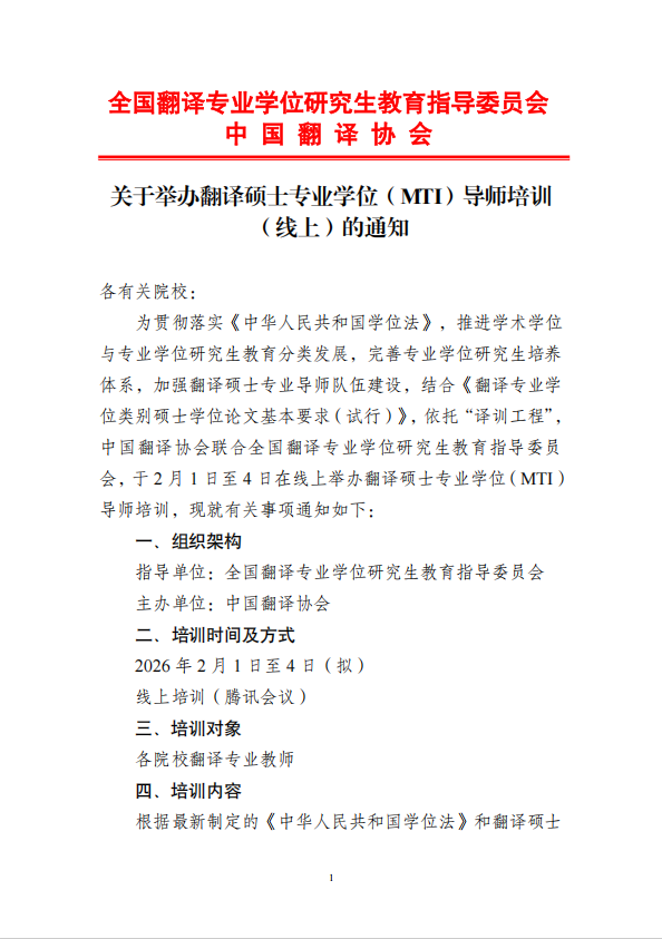关于举办翻译硕士专业学位(MTI)导师培训(线上)的通知